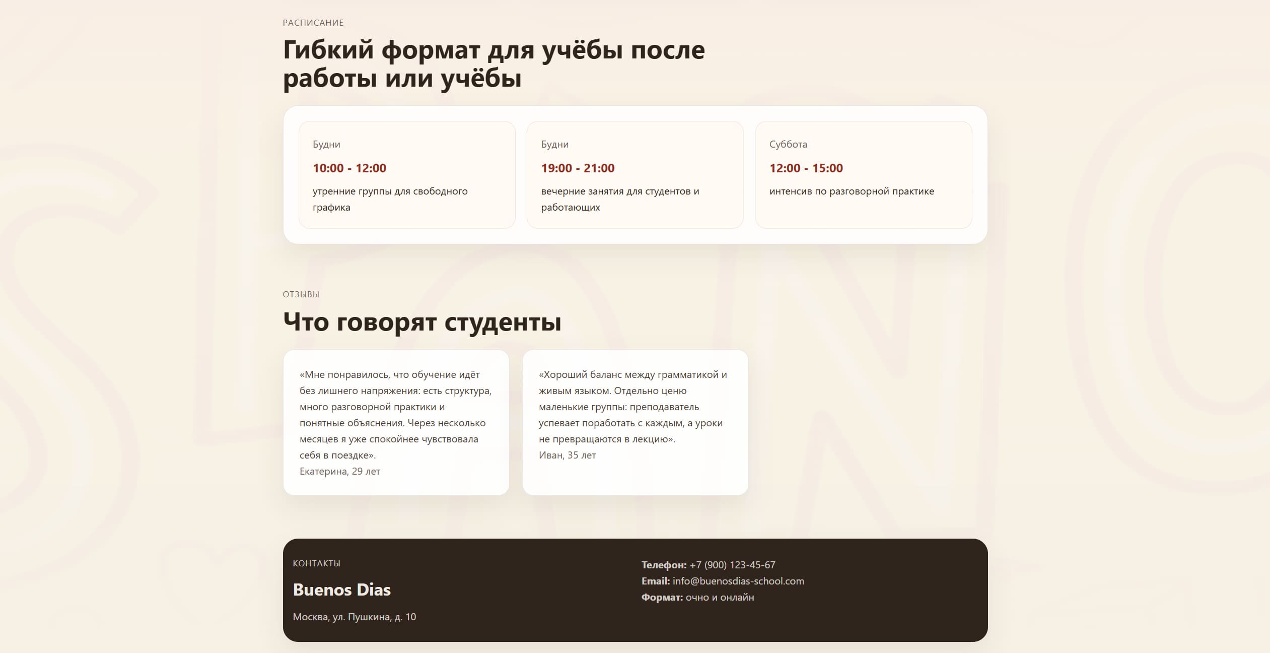 В итоге получился цельный лендинг для школы испанского языка: спокойный, дружелюбный и понятный. Он не пытается быть слишком ярким, а работает через доверие, ясную структуру и ощущение комфортного обучения. За счёт этого сайт подходит под реальную услугу и нормально ведёт пользователя от знакомства со школой до заявки.