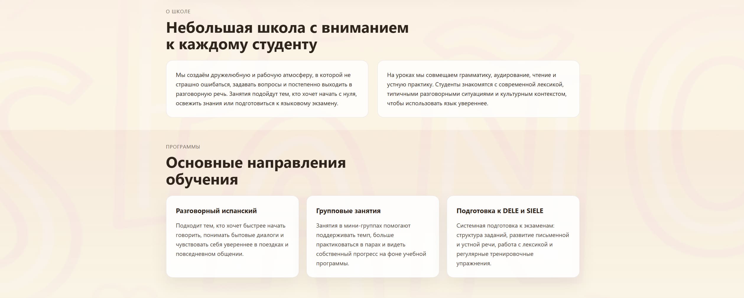 В итоге получился цельный лендинг для школы испанского языка: спокойный, дружелюбный и понятный. Он не пытается быть слишком ярким, а работает через доверие, ясную структуру и ощущение комфортного обучения. За счёт этого сайт подходит под реальную услугу и нормально ведёт пользователя от знакомства со школой до заявки.